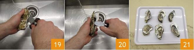 Dann mit einem speziellen Messer mit dünner Klinge und Schutz am Griff gehen Sie in die Bivalven 19, achten Sie darauf, das Weichtier nicht zu zerreißen und sich nicht zu verletzen 20. Legen Sie sie auf einem Tablett an und kümmern Sie sich um die Komposition 21.