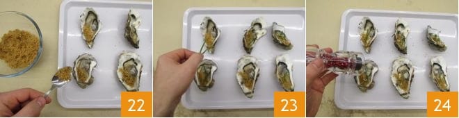 Streuen Sie etwas Panade auf eine Seite der geöffneten Austern 22, dekorieren Sie dann mit den gut abgetropften Frühlingszwiebelstängeln 23, würzen Sie mit einer Prise rosa Pfeffer, frisch gemahlen, und ein paar Tropfen der zuvor zubereiteten Creme. Hier sind Ihre Austern mit Sekt und Frühlingszwiebel bereit: Guten Appetit 24!