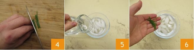 Mit einem Messer teilen Sie sie der Länge nach in zwei Hälften und hacken Sie sie in wenige Millimeter dicke Stäbchen 4. Legen Sie sie in ein Gefäß mit Wasser und Eis 5: So bleiben sie knackig 6.