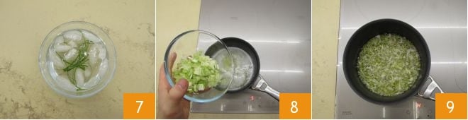 Am Ende werden sie leicht gekräuselt sein 7. Behalten Sie sie für die Dekoration beiseite. Lassen Sie in einem kleinen Topf die Butter bei schwacher Hitze schmelzen und geben Sie die gehackte Frühlingszwiebel hinzu 8, lassen Sie sie zehn Minuten lang unter gelegentlichem Rühren köcheln 9.