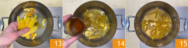 Fügen Sie auch die Zitronenschalen hinzu 13, bringen Sie dann alles zum Kochen, während Sie rühren, um den Zucker vollständig zu lösen. Schalten Sie dann die Hitze aus und geben Sie den Rum hinzu 14; so wird der Alkoholgehalt gesenkt. Rühren Sie um und lassen Sie es abkühlen 15.