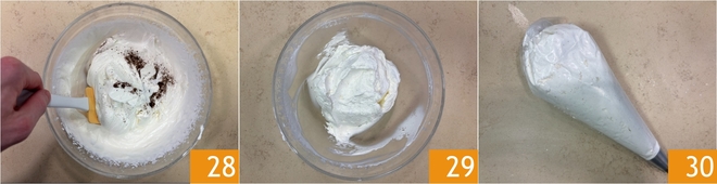 Mischen Sie vorsichtig mit einem Spatel 28, um zu kombinieren 29, dann füllen Sie die fertige Creme in einen Spritzbeutel mit einer 13 mm glatten Tülle 30.
