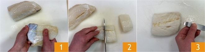 Um den Kabeljau in der Heißluftfritteuse zuzubereiten, entfernen Sie zunächst die Haut des Kabeljaus 1, dann schneiden Sie das Filet in etwa 4 cm große Stücke 2. Schließlich entfernen Sie die Gräten mit einer Pinzette 3.