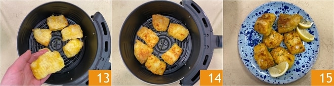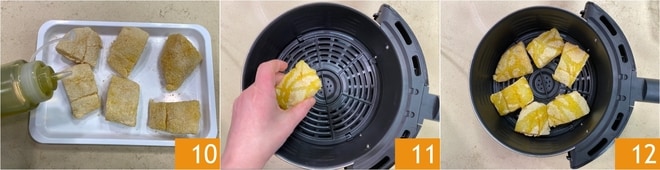 Würzen Sie die panierten Kabeljaufilets mit einem Schuss Öl auf beiden Seiten 10. Legen Sie sie in den Korb der Heißluftfritteuse (wir haben eine Fritteuse mit einer Kapazität von 6 Litern verwendet) 11 und kochen Sie bei 180° für insgesamt 15 Minuten 12.