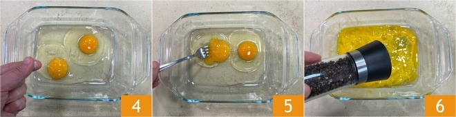 Schlagen Sie die Eier in einer Schüssel auf, salzen Sie 4 und schlagen Sie sie mit einer Gabel 5. Fügen Sie auch den Pfeffer hinzu 6.