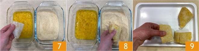 Tauchen Sie die Kabeljaufilets in die Eimischung 7, dann bedecken Sie sie mit Semmelbröseln 8 und legen Sie sie auf ein Tablett 9.