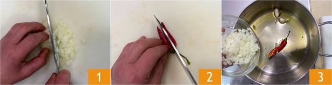 Um den Kabeljau-Eintopf mit Kartoffeln zuzubereiten, putzen Sie zuerst die Zwiebel und hacken sie fein 1, dann schneiden Sie die Chilischote der Länge nach ein 2. In einem Topf lassen Sie etwas Öl mit der Chilischote und den zerdrückten Knoblauchzehen ziehen, dann geben Sie die gehackte Zwiebel hinzu 3 und braten sie für einige Minuten an.