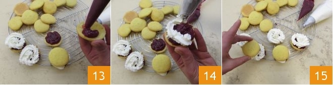 Beginnen Sie, 10 Hüllen auf der Oberfläche mit der Marmelade zu füllen 13. Dekorieren Sie auch mit der geschlagenen Sahne 14, dann legen Sie die anderen Hüllen zum Verschließen darauf 15: Sie erhalten 10 leckere Küsschen.
