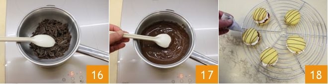 Nehmen Sie schließlich die Schokolade, hacken Sie sie und schmelzen Sie sie im Wasserbad auf diese Weise: Stellen Sie einen kleinen Topf mit wenig Wasser auf den Herd und legen Sie eine Metallschüssel darauf, in die Sie die Schokolade zum Schmelzen geben 16; schmelzen Sie sie im Wasserbad und rühren Sie mit einem Holzlöffel um 17. Wenn sie gut geschmolzen ist, geben Sie sie in ein Pergamentpapier-Hörnchen, das Sie wie einen Spritzbeutel geformt haben (für mehr Details können Sie unsere Kochschule zu Wie man ein Hörnchen aus Pergamentpapier macht konsultieren): Dekorieren Sie Ihre leckeren Küsschen, indem Sie parallele Linien auf die obere Hülle der Kekse zeichnen 18 und... genießen Sie!