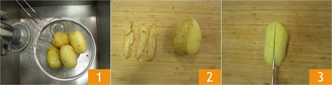 Um die Ofenkartoffeln zuzubereiten, wascht sie zuerst gründlich 1 und schält sie 2. Schneidet die Kartoffeln der Länge nach in zwei Hälften 3 und dann in Viertel.