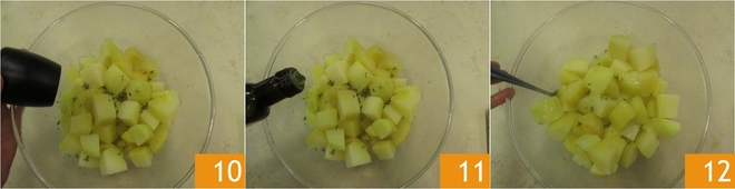 Fügt Salz, Pfeffer 10, Öl 11 hinzu und mischt alles gut mit einem Löffel 12.