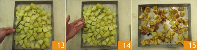 Verteilt die Kartoffeln in einer flachen, vorgefetteten Aluminiumform. Fügt Rosmarinzweige 13 und zwei Knoblauchzehen 14 hinzu. Backt die Kartoffeln im vorgeheizten Umluftofen bei 220°, in der mittleren Schiene, für 40 Minuten oder bis sie gut gebräunt sind. In der Mitte der Backzeit empfiehlt es sich, die Kartoffeln vorsichtig zu mischen, um eine gleichmäßige Bräunung zu gewährleisten. Am Ende der Garzeit die Ofenkartoffeln aus dem Ofen nehmen, die Knoblauchzehen entfernen und servieren 15.