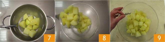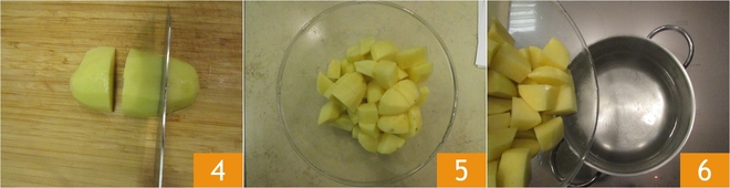 Daraus schneidet ihr etwa zwei Zentimeter große Würfel 4 und gebt sie nach und nach in eine Schüssel 5. Bringt in einem Topf reichlich Wasser zum Kochen und taucht die Kartoffeln ein 6.