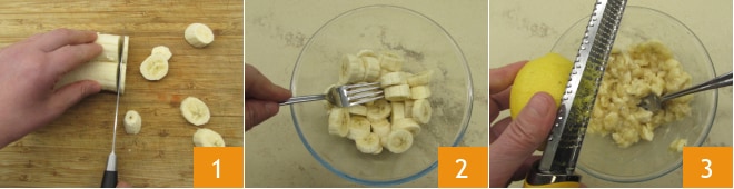 Um den Bananen-Joghurt-Kuchen zuzubereiten, schält zuerst die Bananen und schneidet sie in Scheiben 1, zerdrückt sie mit einer Gabel 2: Ihr solltet etwa 100 g Fruchtfleisch erhalten. Fügt die abgeriebene Zitronenschale hinzu 3, mischt und stellt beiseite.