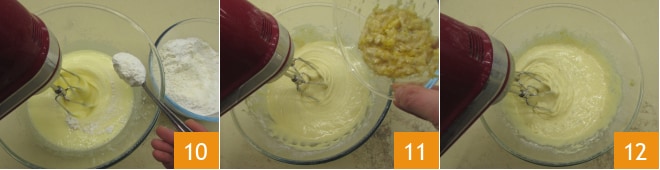 Gebt die trockenen Zutaten nach und nach zur Masse, während ihr mit den Schneebesen weiterarbeitet 10. Wenn die trockenen Zutaten gut eingearbeitet sind, fügt die zerdrückten Bananen hinzu 11 und mischt, um eine homogene Masse zu erhalten 12.