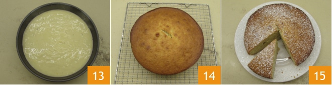Gebt die Masse in eine Kuchenform mit einem Durchmesser von 22 cm, die ihr vorher eingefettet habt 13. Backt im vorgeheizten statischen Ofen bei 180° etwa 40 Minuten lang. Nachdem ihr die Garprobe mit einem Zahnstocher gemacht habt, nehmt den Kuchen aus dem Ofen und lasst ihn vollständig auf einem Gitter abkühlen 14, dann bestäubt ihn nach Belieben mit Puderzucker. Euer Bananen-Joghurt-Kuchen ist servierfertig 15!