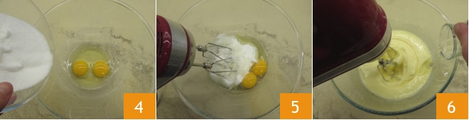 Gebt die Eier und den Zucker in eine Schüssel 4 und arbeitet mit den elektrischen Schneebesen 5. Wenn die Masse hell und schaumig wird, gießt das Öl in einem feinen Strahl hinzu 6.