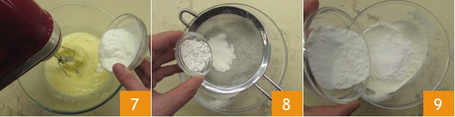Gebt auch den Joghurt dazu 7 und arbeitet weiter mit den Schneebesen, um alles zu vermischen. Siebt in einer separaten Schüssel das Mehl mit dem Backpulver und dem Salz 8, fügt das Reismehl hinzu 9 und mischt.