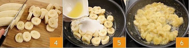 Nun widmen Sie sich der Füllung: Schälen Sie die Bananen und schneiden Sie sie in etwa einen halben Zentimeter dicke Scheiben 4, geben Sie sie mit der Butter, dem Saft einer halben Zitrone und 40 g Zucker in eine Pfanne 5. Kochen Sie bei mittlerer Hitze, bis die Bananen weich und cremig sind 6.
