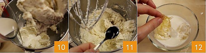Beginnen Sie, die Zutaten mit den Rührbesen der Küchenmaschine zu vermischen. Wenn Sie keine Küchenmaschine besitzen, verwenden Sie ein Handrührgerät oder einen Schneebesen. Fügen Sie dann 100 ml frische flüssige Sahne in einem dünnen Strahl hinzu 10, während Sie die Mischung weiter rühren. Aromatisieren Sie die Creme schließlich mit einem Teelöffel Vanilleextrakt. Alternativ können Sie eine Tüte Vanillin oder die Samen einer Vanilleschote verwenden 11. Weichen Sie anschließend die Gelatine für 10 Minuten in kaltem Wasser ein. Für Details zum Prozess können Sie die Anleitung Wie man Gelatine verwendet ansehen. Drücken Sie die Gelatineblätter gut aus und lösen Sie sie in einem Esslöffel erwärmter flüssiger Sahne auf 12.