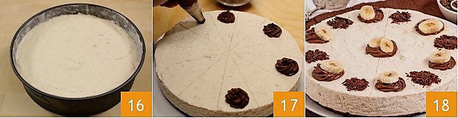 Wenn der Käsekuchen fest geworden ist und bereit ist 16, lösen Sie ihn aus der Form und übertragen Sie ihn auf eine Servierplatte. Schneiden Sie mit dem Spatel Linien ein, als ob Sie ihn in Stücke teilen würden. Garnieren Sie ihn mit kleinen Spritzbeuteln aus geschmolzener Zartbitterschokolade, wobei Sie eine Sterntülle verwenden 17. Sie können auf die Spritzbeutel zart Bananenscheiben legen und die Dekoration mit Zartbitterschokoladenraspeln abwechseln. So haben Sie Ihren Bananen-Schokoladen-Käsekuchen bereit zum Servieren 18.