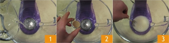 Um die Baozi zuzubereiten, bereiten Sie zuerst den Teig vor: Geben Sie das Wasser in die Schüssel einer Küchenmaschine mit Knethaken 1, fügen Sie die Trockenhefe hinzu 2 und rühren Sie kurz mit einem Löffel um, um sie aufzulösen 3.