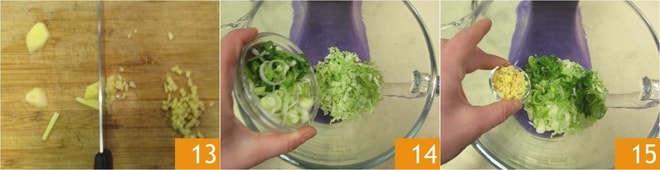 Schälen und hacken Sie den Ingwer oder reiben Sie ihn alternativ 13. In die Schüssel der Küchenmaschine mit Flachrührer geben Sie den Chinakohl, die Frühlingszwiebel 14 und den Ingwer 15.