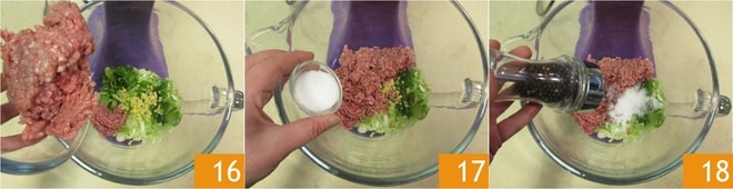 Fügen Sie das Schweinehackfleisch hinzu 16, den Zucker 17, das Salz und den Pfeffer 18.