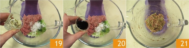 Würzen Sie schließlich mit Sesamöl 19 und Sojasoße 20 und schalten Sie die Küchenmaschine bei minimaler Geschwindigkeit für 5 Minuten ein, bis die Zutaten gut vermischt sind 21.