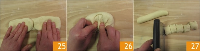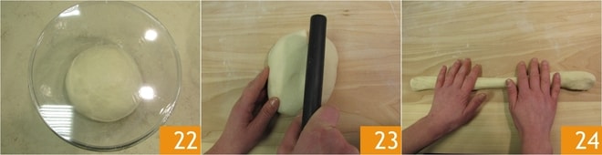 Nach der Gehzeit 22 übertragen Sie den Teig auf die leicht bemehlte Arbeitsfläche und teilen Sie ihn nach kurzem Bearbeiten mit einem Teigschaber in 3 Portionen 23. Rollen Sie jede Portion mit den Fingerspitzen zu Stangen 24.
