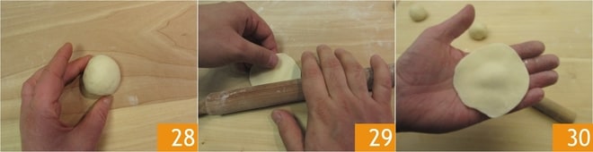 Runden Sie jedes Teigstück auf der Arbeitsfläche zu einer Kugel 28, dann drücken Sie sie mit der Handfläche flach. Nehmen Sie nun ein kleines Nudelholz und drücken Sie es auf die Ränder der Scheibe mit der rechten Hand, während Sie mit der linken Hand den Teig gegen den Uhrzeigersinn drehen 29; so werden die Ränder dünner, während die Mitte dicker bleibt, um die Säfte der Füllung besser zu halten 30.