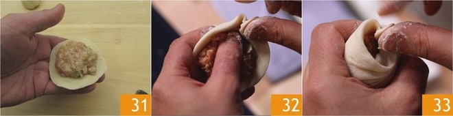 Verfahren Sie auf diese Weise mit allen Teigscheiben, dann teilen Sie die Füllung in 25 g Portionen. Geben Sie eine Portion Füllung in die Mitte jeder Scheibe 31 und verteilen Sie sie leicht mit einem Teelöffel. Um die Baozi zu schließen, bemehlen Sie Ihre Finger gut, um zu verhindern, dass die Ränder feucht werden: Halten Sie den Daumen fest am Rand des Teigs 32, während Sie mit dem Zeigefinger den restlichen Teig ziehen und kniffen 33.