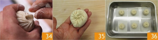 Am Ende kniffen Sie die Oberseite und drehen Sie den Baozi mit der Hand, um ihn zu versiegeln 34, dann rollen Sie ihn auf der Arbeitsfläche, um ihn zu runden 35. Während Sie die Baozi formen, legen Sie sie auf Quadrate aus Backpapier, die Sie zuvor auf einem Backblech ausgelegt haben. Wenn alle geformt sind 36, decken Sie das Blech mit Frischhaltefolie ab und lassen Sie es bei Raumtemperatur 40 Minuten gehen.