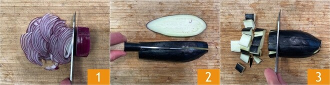 Um den Basmati mit Gemüsecaponata zuzubereiten, bereiten Sie zuerst das Gemüse vor: Putzen Sie die roten Zwiebeln und schneiden Sie sie in feine Streifen 1, dann schneiden Sie die Auberginen in 2 cm dicke Scheiben 2 und würfeln Sie sie 3.