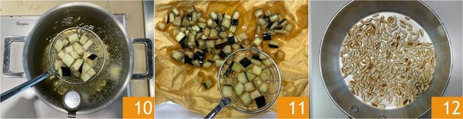 Bringen Sie das Pflanzenöl auf eine Temperatur von 180 °C und frittieren Sie die Auberginen in kleinen Mengen für etwa 3-4 Minuten 10. Lassen Sie die Auberginen auf Küchenpapier abtropfen 11 und beiseite stellen. Geben Sie die Pinienkerne in eine bereits heiße Pfanne und rösten Sie sie bei mittlerer Hitze für etwa 5 Minuten, wobei Sie sie häufig bewegen. Wenn sie gebräunt sind, nehmen Sie die Pfanne vom Herd und stellen Sie sie beiseite 12.