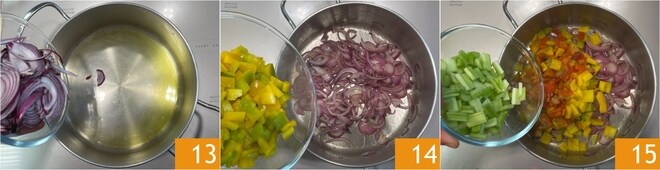 Fahren Sie mit der Zubereitung der Caponata fort: Erhitzen Sie einen großzügigen Schuss Öl in einem großen Topf, dann geben Sie die Zwiebeln hinzu 13 und braten Sie sie bei mittlerer Hitze für 3 Minuten an. Fügen Sie die Paprika 14 und den Sellerie 15 hinzu und braten Sie sie für 5 Minuten an.