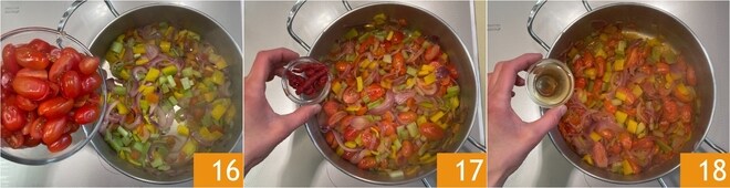 Fügen Sie nun die Kirschtomaten 16 und das Tomatenmark 17 hinzu und kochen Sie für weitere 5 Minuten, dann geben Sie den Essig hinzu 18.