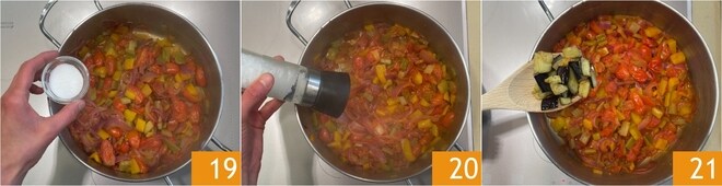 Würzen Sie auch mit Zucker 19 und Salz 20. Lassen Sie den Essig verdampfen, dann fügen Sie die Auberginen hinzu 21 und kochen Sie weitere 10 Minuten.