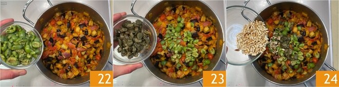 Kurz vor dem Ende der Kochzeit fügen Sie die gehackten Oliven 22, die entsalzten Kapern 23 und die gerösteten Pinienkerne 24 hinzu.