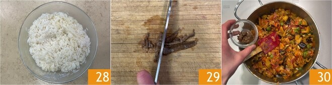 Gießen Sie den Reis ab und geben Sie ihn in eine große Schüssel, dann lassen Sie ihn abkühlen 28. In der Zwischenzeit hacken Sie die Sardellenfilets 29 und fügen Sie sie zur inzwischen abgekühlten Caponata hinzu 30.