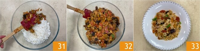 Vermengen Sie die Caponata mit dem lauwarmen Reis 31 und mischen Sie gut 32. Servieren Sie Ihren Basmati mit Gemüsecaponata, garniert mit frischen Basilikumblättern 33!