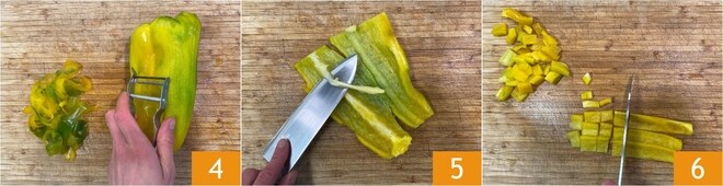 Schälen Sie die Paprika mit einem Sparschäler 4, entfernen Sie die Kerne und die inneren Fasern 5. Schneiden Sie die Paprika zuerst in Streifen und dann in etwa 1,5 cm große Stücke 6.