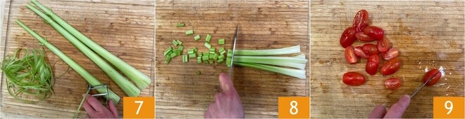 Schälen Sie auch die Selleriestangen 7 und würfeln Sie sie 8. Schließlich halbieren Sie die Kirschtomaten 9.