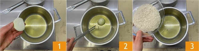 Um den Basmati-Reis mit Lachs, Sesam und scharfer Sauce vorzubereiten, erhitzen Sie zuerst das Wasser, das Sie zum Kochen des Reises benötigen. Erhitzen Sie das Olivenöl in einem großen Topf, fügen Sie eine halbe Zwiebel 1 und eine zerdrückte Knoblauchzehe 2 hinzu und lassen Sie es einziehen. Entfernen Sie den Knoblauch und die Zwiebel und geben Sie den Basmati-Reis hinzu 3.