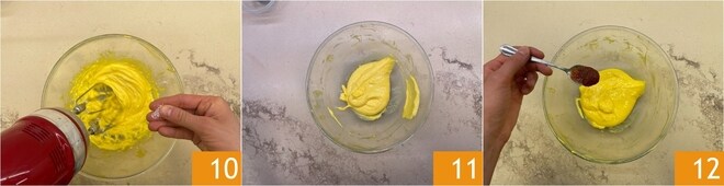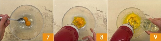 In der Zwischenzeit bereiten Sie die Mayonnaise vor: In einer Schüssel die Eier bei Raumtemperatur und den Zitronensaft 7 mischen. Beginnen Sie, die Eier mit einem Handrührgerät aufzuschlagen 8 und wenn sie an Konsistenz gewonnen haben, fügen Sie das Sonnenblumenöl in einem dünnen Strahl hinzu 9 und integrieren Sie es nach und nach, bis es vollständig aufgenommen ist.