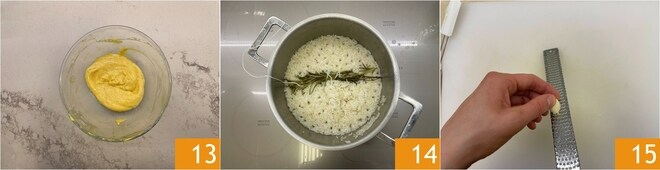 Stellen Sie die Mayonnaise beiseite 13. In der Zwischenzeit ist der Reis fertig gekocht 14, entfernen Sie das Kräuterbündel und stellen Sie es beiseite. Bereiten Sie das Gemüse vor: Reiben Sie den Knoblauch 15.