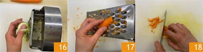 Reiben Sie ebenso die Zucchini 16 und die Karotten mit einer groben Reibe 17. Schälen Sie die Paprika und schneiden Sie sie in Streifen 18.