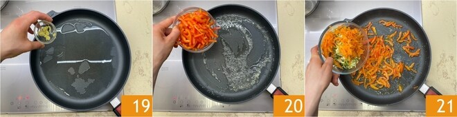 In einer antihaftbeschichteten Pfanne fügen Sie Pflanzenöl und den gehackten Knoblauch hinzu 19, lassen Sie es einige Minuten einziehen, dann fügen Sie die Paprika 20 und das geriebene Gemüse hinzu 21.