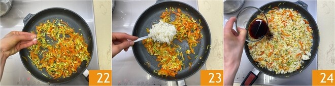 Braten Sie alles zusammen für 5 Minuten und salzen Sie es 22. Fügen Sie den Reis hinzu 23 und braten Sie ihn mit dem Gemüse. Am Ende des Kochvorgangs schalten Sie die Hitze aus und fügen die Sojasauce hinzu 24, indem Sie alles zusammen mischen.