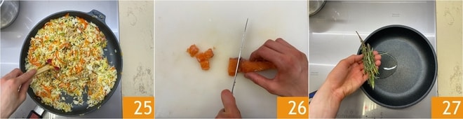 Halten Sie es warm 25 und kümmern Sie sich um den Lachs: Schneiden Sie den Fisch in Würfel 26, geben Sie etwas Öl in eine Pfanne und ein Kräuterbündel aus Thymian und Rosmarin 27.